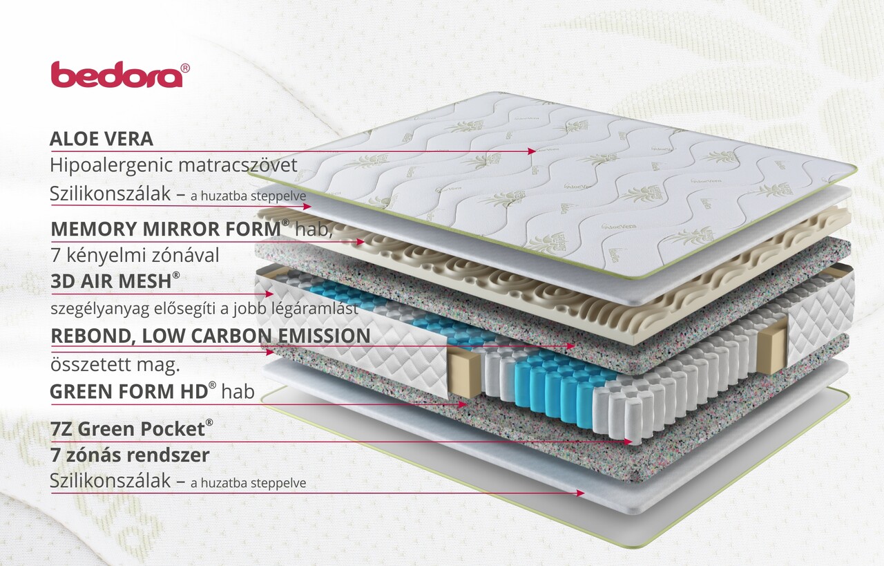 A matrac fő komfortrétege Green Form HD® nyitott cellás rugalmas habból készült, amely biztosítja a gerinc természetes helyzetét alvás közben. A nagyvonalú, 3 cm-es Memory Mirror Form® 7 Comfort Zone habréteget úgy tervezték, hogy kiküszöbölje a nyomáspontokat (vállak, csípő és lábak), így alvás közben teljes izomlazítást biztosít, és biztosítja a megfelelő vérkeringést.
