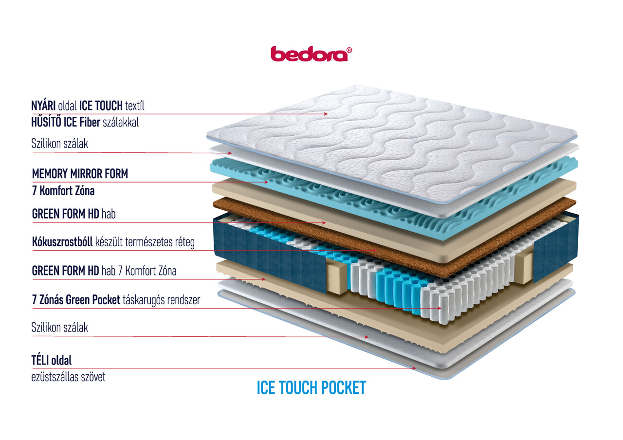MEMORY MIRROR FORM A huzatban elhelyezett 4 cm vastagságú MEMORY MIRROR FORM habrétegek hideg részecskéket tartalmazó ARCTIC GEL-lel és 2 cm vastagságú MEMORY MIRROR FORM habok testre simulnak, megszüntetve a nyomáspontokat, segítve a izomlazítást és biztosítva az egészséges vérkeringést. |
