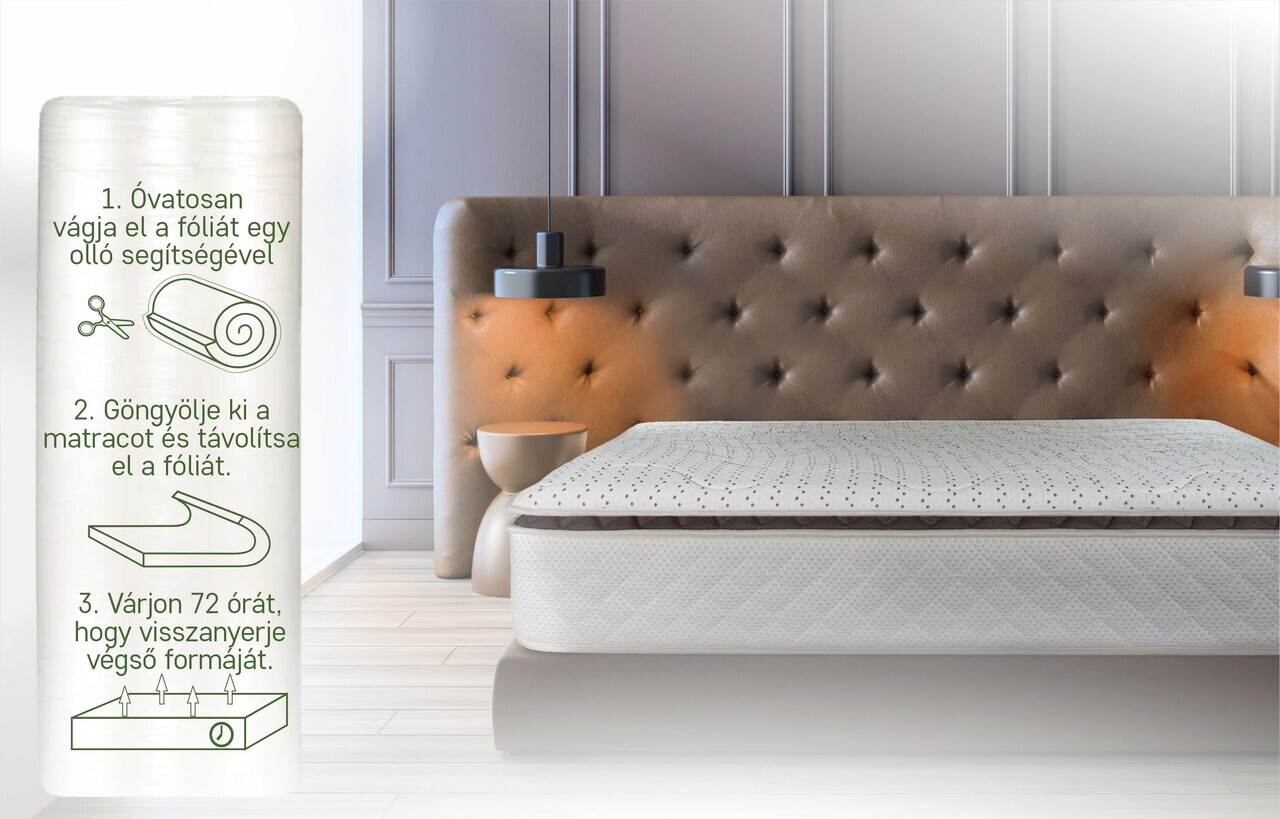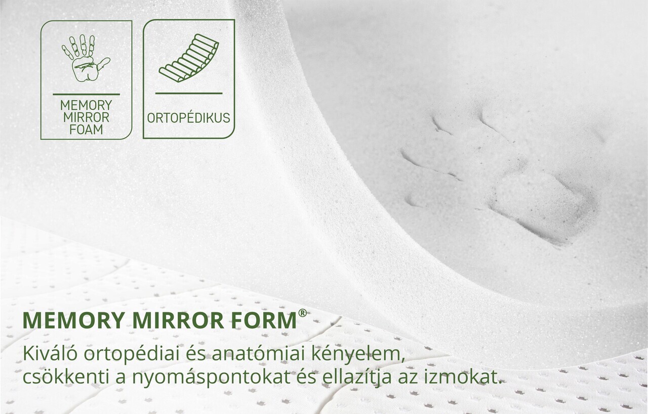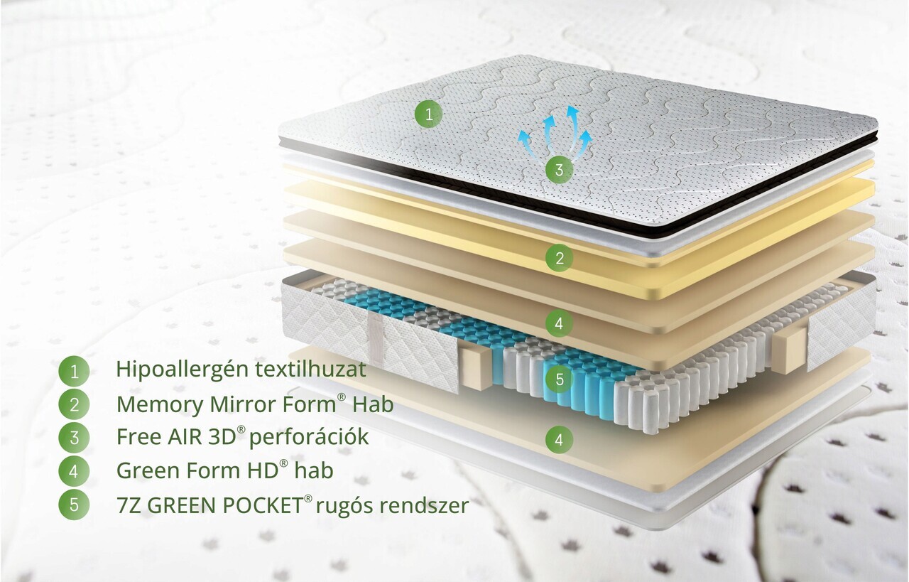 Kiváló minőségű anyagokból készült matrac ötvözi az egyedileg csomagolt zsebrugók technológiáját a Green Form HD® rugalmas hab és a Green Therm Memory® hab technológiájával a kiváló ortopédiai és anatómiai kényelem érdekében.