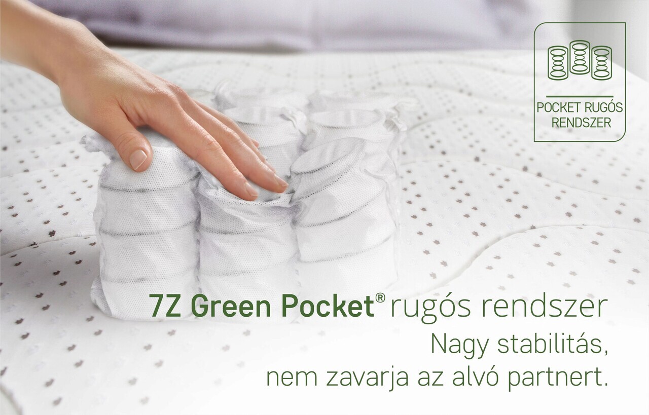 A rugókat külön-külön csomagolják textildobozokba, és a rájuk gyakorolt ​​nyomástól függetlenül hatnak, így anatómiailag tökéletesen formálódnak a testen. Közöttük lévő kapcsolatok nélkül nem kapcsolja be a többi rugót mozgásban, nagy stabilitást és nulla kényelmetlenséget kínálva az alváspartner számára. Ezenkívül a 7Z Green Pocket® rendszer lehetővé teszi a testrészek különböző megtámasztását attól függően, hogy milyen nyomást gyakorolnak rájuk a matrac felületére, hogy biztosítsák a gerinc csigolyáinak helyes és egészséges beállítását.
