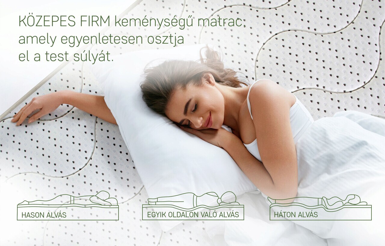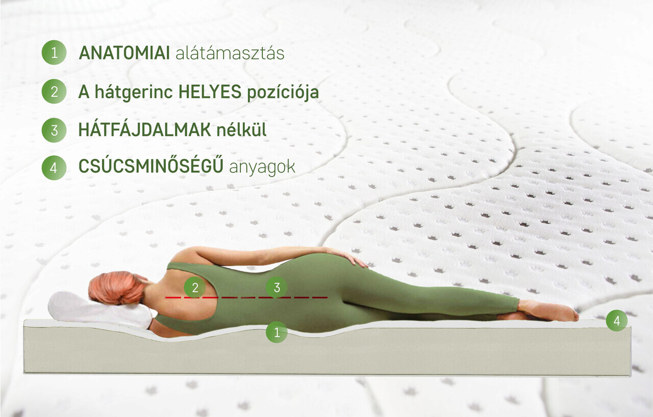 A matrachoz rögzített felső rész a kényelmi réteg. Nyílt cellás Green Form HD® rugalmas habból és a Green Therm Memory® habból áll, amely a testhez formálódik, és alvás közben megszünteti a nyomáspontokat az izmok ellazításához és az egészséges vérkeringés biztosításához.