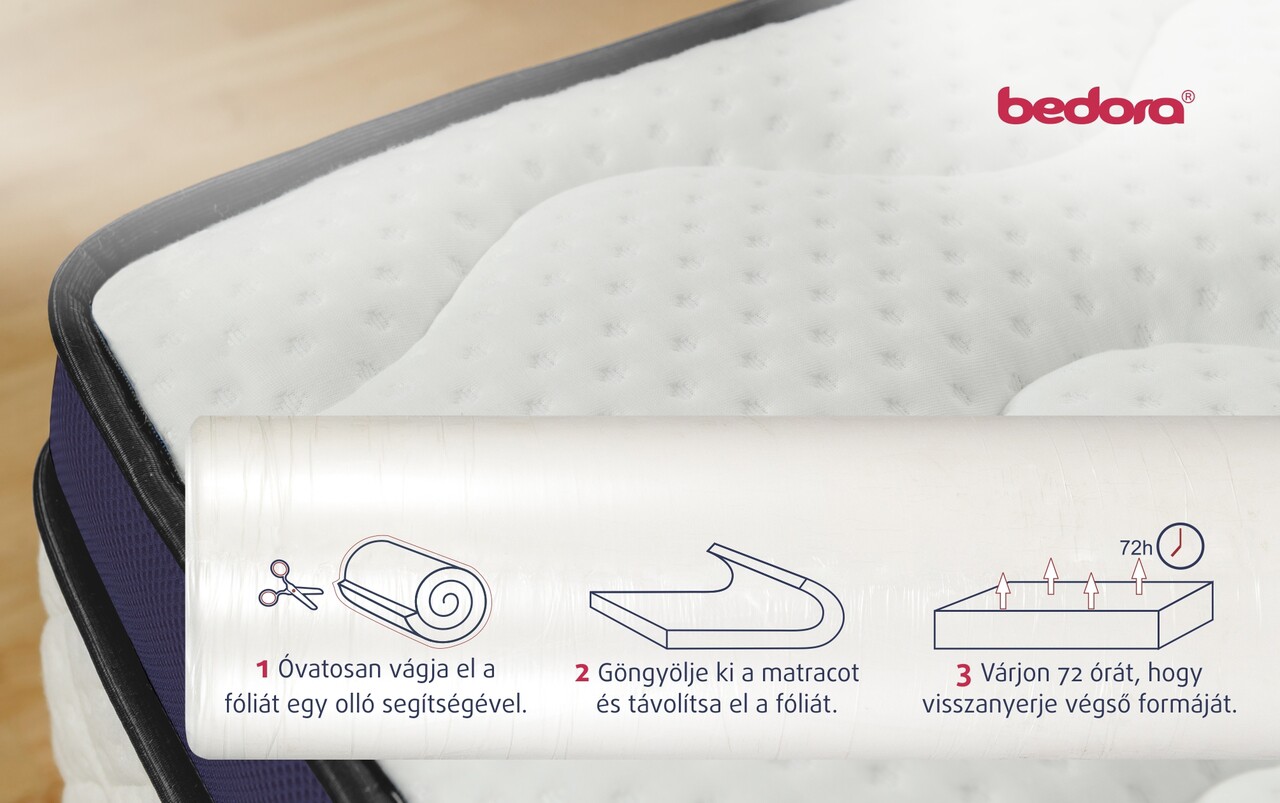 Matrac feltekert és vákumozott. Kérjük, figyelmesen olvassa el a kezelési és kicsomagolási útmutatót.