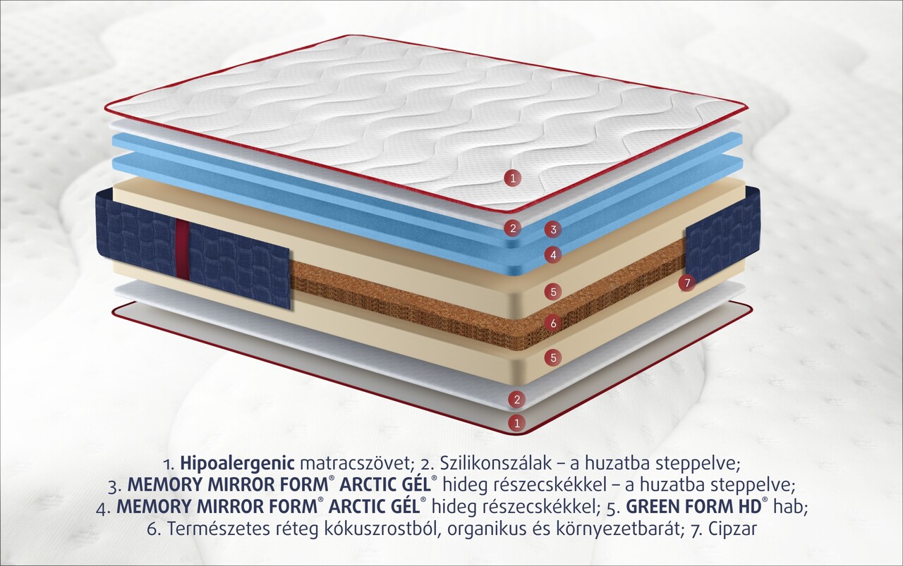 A Green Form HD® támasztóhab és az Arctic Gel® részecskékkel ellátott Green Therm Memory® réteg fejlett technológiája biztosítja a pihentető alvást a partner mozgásának terjedése nélkül.